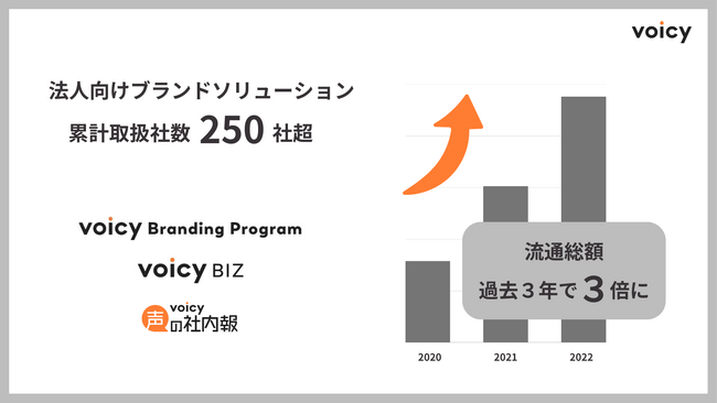 株式会社Voicyでは、法人に提供するソリューションの流通総額が前前年比3倍へと成長し、取扱企業数は累計250社を突破しました。プラットフォームとしても会員登録者数180万人と2年で100万人増加、女性会員が増えたことで企業による女性向け訴求需要にも対応できるようになりました。「Voicy Branding Program」のプランのひとつであるチャンネルスポンサーでは、リスナーへの調査から95%以上の人が半年後もスポンサーを記憶していることがわかり、繰り返し聴くほど好感度が上昇する“嫌われない広告”が実現しています。導入企業のなかには、チャンネルスポンサーとタイアップ放送の組み合わせで想定購入数を大きく上回る効果を実現した事例が登場しています。Voicyは声の可能性を最大化し、企業活動への共感の和を広げるべく、さらなるサポートへのチャレンジをおこなっていきます。
