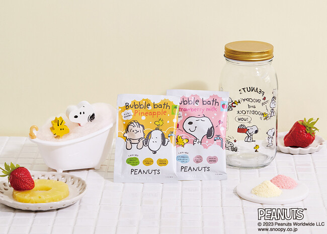 分包タイプのバブルバスが4包入ったバスギフト。ガラスボトルにはいろいろなポーズのスヌーピーをあしらっていて、とってもキュート!