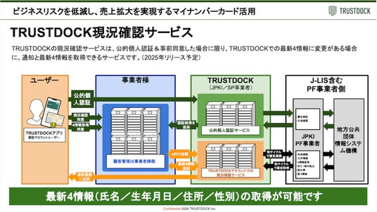 「この現況確認サービスと、お客様のシステム基盤を連携させることで、TRUSTDOCKがお客様に代わってJ-LISシステムの方に最新情報を常に取得しに行きます。これにより、お客様は基本4情報について顧客情報をメンテナンスすることなく、常に最新の情報を活用した施策を打つことができるようになります」