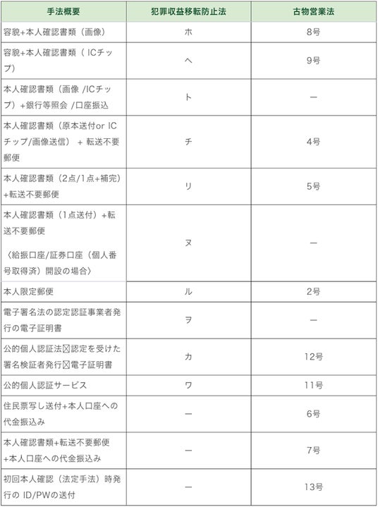本人確認の手法については、犯罪収益移転防止法は施行規則6条1項1号に、古物営業法は施行規則15条3項にて、それぞれ定められています。その中の「非対面手法」についてまとめたものが以下となります。