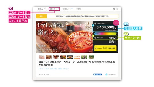 当社は、「Makuake」で得られる応援購入金額やサポーター数、応援コメントの内容、活動レポート投稿数及びその平均コメント数といったデータを「01Bank」に提供することにより、従来の融資判断では見極めることが困難だった事業者の将来性や成長性の評価を反映した事業性評価融資を後押しします。