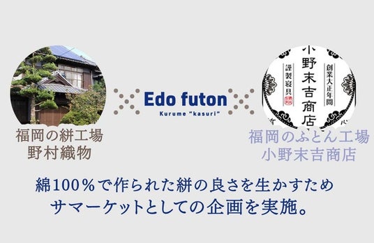 九州・福岡県を拠点に家具・インテリアのEC事業を展開するタンスのゲン株式会社(以下、タンスのゲン、本社:福岡県大川市、代表取締役:橋爪裕和)は、地域貢献型の製品開発を掲げる「地域特産リデザイン」プロジェクトの第5弾として、福岡県の絣工場、布団工場と連携し、福岡県久留米市に200年も続く歴史ある織物「久留米絣」を用いた『久留米絣サマーケット』を発売することをお知らせします。