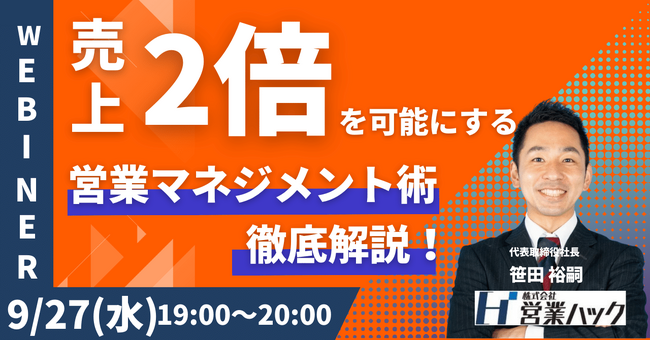 社員全員がフルリモートワークで営業支援を行う株式会社営業ハック(本社:東京都・代表:笹田裕嗣)がウェビナーを行います。日時は2023年9月27日(水) 19:00~20:00、参加費は無料です。