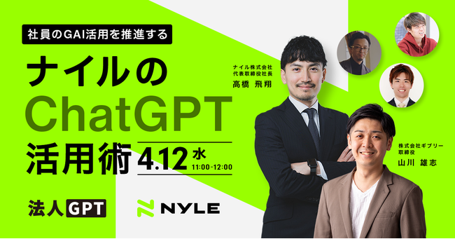 マーケティングDX事業、自動車産業DX事業を運営するナイル株式会社(本社:東京都品川区、 代表取締役社長:高橋飛翔、 以下ナイル)は、AIチャットボット、AI-FAQなどの業務自動化ソリューションを提供する株式会社ギブリー(本社:東京都渋谷区、代表取締役社長:井手高志、以下ギブリー)主催のオンラインウェビナー「社員のGAI活用を推進するナイルのChatGPT活用術」に参加。代表高橋飛翔、他、社員3名が登壇いたします。