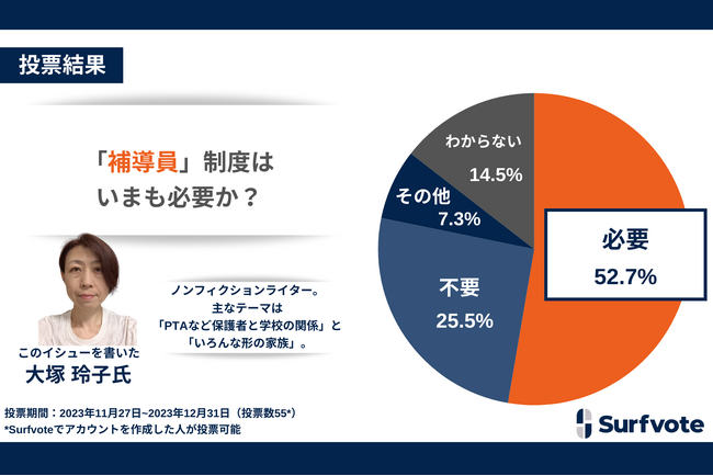 なかにはPTAに人数を割り当てる自治体もあり、なり手が見つからず、役員さんが困っているケースも見かけます。そんな「補導員」が必要かどうかについて、Surfvoteを通じてひろく意見を募集しました。