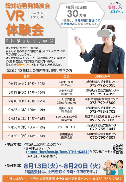 その取り組みの1つとして、市制70周年記念事業の一環として、「認知症啓発講演会・VR体験会」を認知症月間である9月に併せて実施します。実施に向けて、8月13日(火)から申し込みをスタートします。