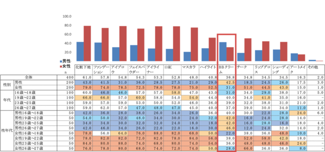 男性は「口紅」や「チーク」といった色味の強いものや、一気に“メイク感”が出やすい「マスカラ」の使用率は抑えられている一方で、「BBクリーム」が42.5%に上っています。この割合は、女性の使用率31.0%よりも高く、男性特有のメイク傾向であると言えます。