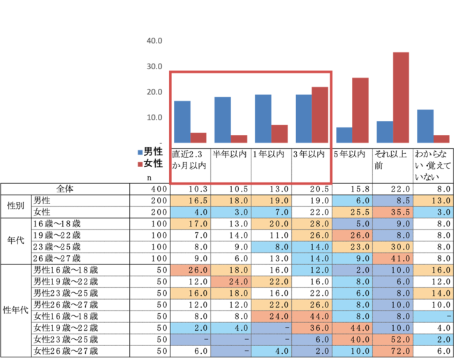 女性は5年以上前が最も多く、直近になるにつれ徐々に減っていくのに対し、男性は「直近2.3か月以内」が16.5%・「半年以内」が18.0%・「1年以内」が19.0%・「3年以内」が19.0%と均等に存在しており、このコロナ禍のタイミングでメイクを始める人の多さが浮き彫りとなりました。