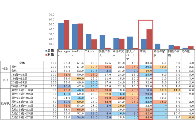 男女ともにトップは「Instagram」、そこに「YouTube」「Tiktok」が続く流れは変わりませんでした。しかし男性の場合、「店頭」よりも「異性の友人」「恋人/パートナー」から情報を知る割合が多いことがわかります。前掲した設問【メイクを始めたきっかけ】に一定数いた、「恋人(パートナー)にすすめられた」「友達にすすめられた」という受動タイプの実態がここに表れているようです。