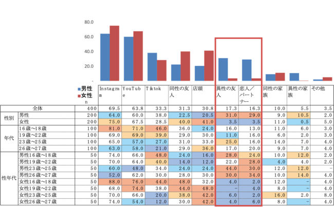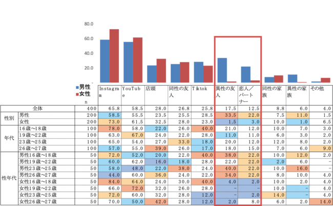 日頃のメイク情報収集だけでなくメイク用品の購入時であっても、前掲した設問【メイクに関する情報をどこで知るか】と同様に、情報源として「異性の友人」「恋人/パートナー」の強さが目立ちます。33.5%を集めた「異性の友人」にいたっては、28.5%のTiktokの割合を超えました。