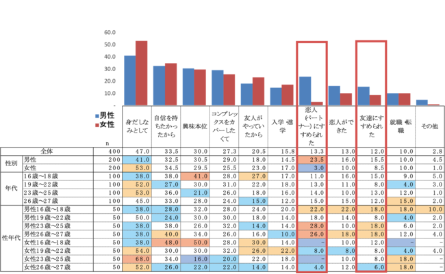 最も多いきっかけが「身だしなみとして」、そこに「自信を持ちたかったから」「興味本位」が続くという順序自体には、基本的に男女差はありませんでした。しかし、「恋人(パートナー)にすすめられた」「友達にすすめられた」という受動タイプの割合については、女性よりも男性の方が大幅に高いことがわかります。