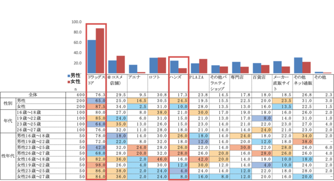 女性の場合「ドラッグストア」に87.5%と集中しているのに対し、男性の場合は65.0%の「ドラッグストア」を除いて、割合が近しい結果となりました。