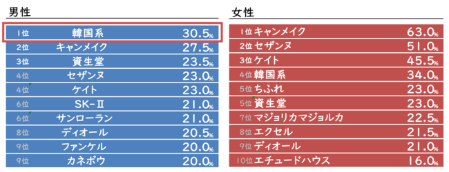 そんな中特徴的だったのが、男性のトップが日本製を抑え韓国系となった点です。韓国コスメブランドの宣伝には男性アイドルが起用されることも多く、男性でも手に取りやすいのかもしれません。