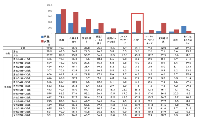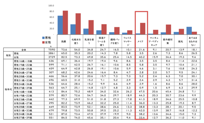 2.調査の対象:アイリサーチ登録モニターのうち、全国の16歳以上27歳以下の男女(スクリーニング調査:16歳~39歳/本調査:16歳~27歳)のうちメイクを習慣的にしている人