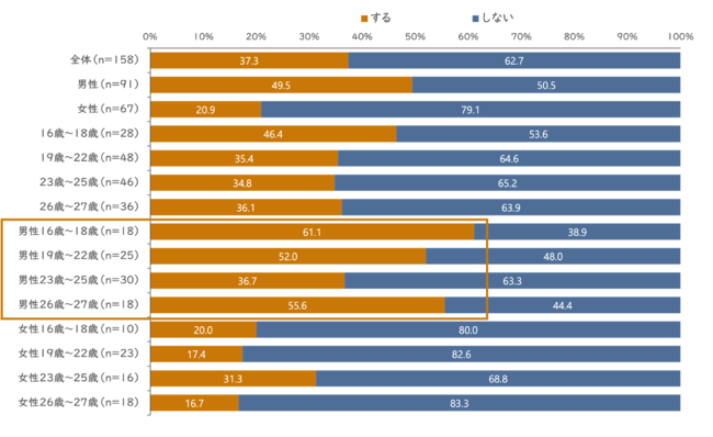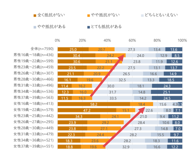 抵抗がない(「抵抗がない」「やや抵抗がない」の合算)と回答した割合が特に高かった「16歳~18歳」については、女性で76.6%、男性で54.6%に上りました。