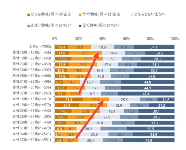 特に「16歳~18歳」は最も関心度合いが強く、「とても興味(関心)がある」「やや興味(関心)がある」の合算は女性で45.4%、男性で39.3%に上りました。