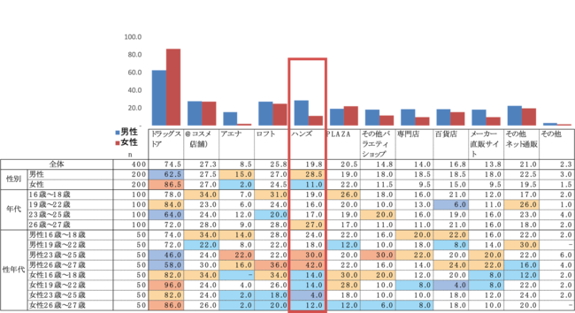 中でも、特に男女差が激しかったのが「アエナ」「ハンズ」。「ハンズ」は男性が24.5%に対し女性は10.0%にとどまりました。ハンズではオリジナルのメンズスキンケアシリーズも販売しており、男性にとってはメイク用品のある場所として馴染みがあるのかもしれません。