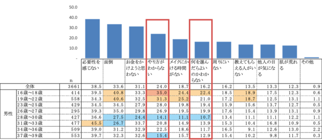 また、これらの理由の割合は「周りにいない」「他人の目が気になる」といった、自身がメイクすること自体の恥ずかしさや後ろめたさといった類の理由よりも上回っているため、知識さえ満たされればメイクにトライする可能性も考えられるでしょう。