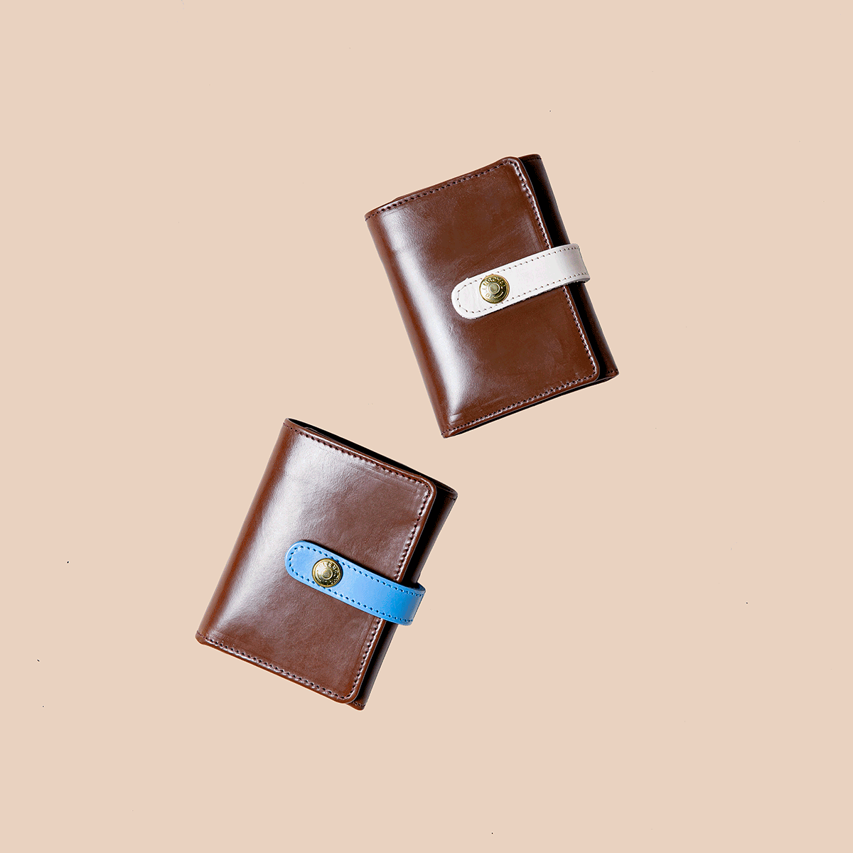 上質なブライドルレザーを贅沢に使用したトフィーブラウンのバッグと、新生活におすすめのスモールレザーグッズはトフィーブラウンにベイビーブルーとアイボリーを効かせたバイカラーで展開。
