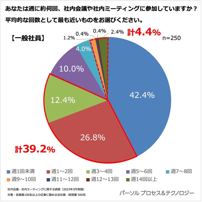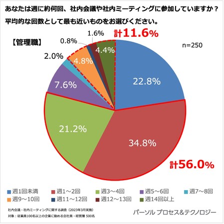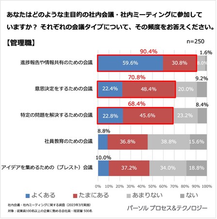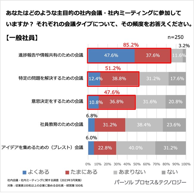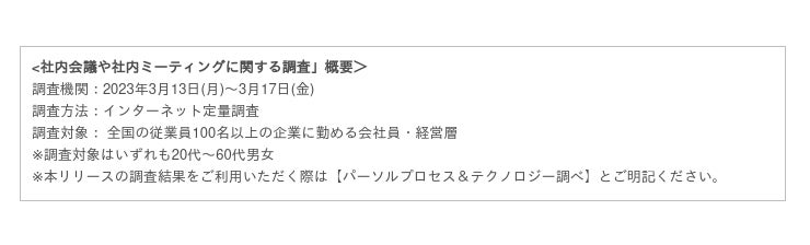 総合人材サービス・パーソルグループのパーソルプロセス&テクノロジー株式会社(東京都江東区、代表取締役社長:横道 浩一、以下「パーソルP&T」)は、従業員100名以上の企業に勤める会社員・経営層500名(管理職250名/一般社員250名)を対象に、現在勤めている会社で行われる「社内会議や社内ミーティングに関する実態調査」を実施しました。