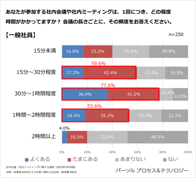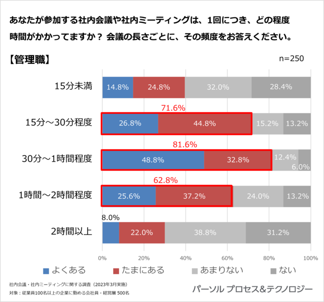 会議の長さごとに、その頻度をお答えください。(n=500<管理職250 一般社員250>、単一回答)