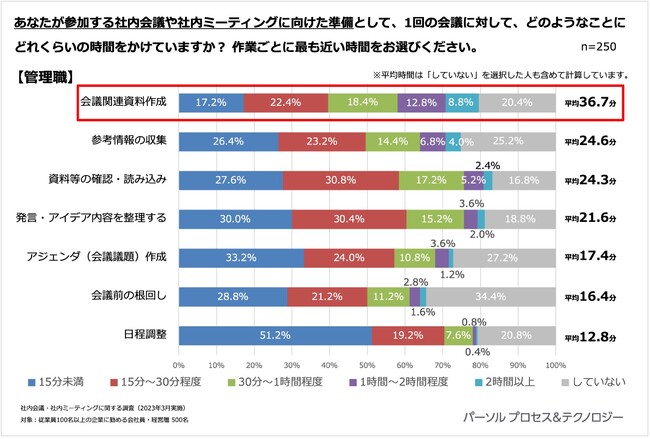 会議の準備作業をしている人のうち、最も多く時間をかけているのは「会議関連資料の作成」で、管理職では平均36.7分、一般社員では平均26.9分、かけていることわかりました。