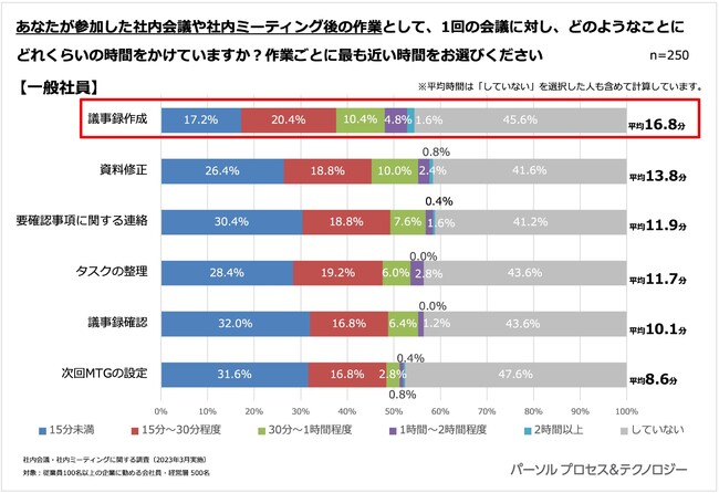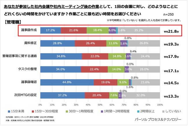 会議後の作業として最も多く時間をかけているのは、管理職も一般社員も共に「議事録作成」となりましたが