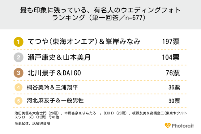フォトウエディング・結婚式前撮りの実施者、実施予定者677人への「最も印象に残っている、有名人のウエディングフォトを教えてください(単一回答)」では、1位「てつや(東海オンエア)&峯岸みなみ(197票)」、2位「瀬戸康史&山本美月(104票)」、3位「北川景子&DAIGO(76票)」、4位「桐谷美玲&三浦翔平(36票)」、5位「河北麻友子&一般男性(30票)」となりました。※表記は、氏名50音順