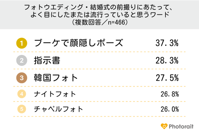 2022年以降にフォトウエディング・結婚式前撮りを実施した、または実施予定の方466人に「フォトウエディング・結婚式前撮りの撮影にあたって、よく目にした、または流行っていると思うワード(複数回答)」を聞いたところ、1位は「ブーケで顔隠しポーズ(37.3%)」となりました。ふたりの顔をブーケで隠すポーズは、こだわりアイテムを主役にした撮影として人気が高く、結婚式のウェルカムボードやペーパーアイテムでの活用や、SNSでシェアする際にスタンプ加工で隠すのではなく自然に顔を隠す目的で撮影されるケースも多かったようです。
