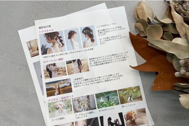 2位の「指示書(28.3%)」は、カップルが撮影にあたっての要望をフォトスタジオやフォトグラファーに伝えるためのものです。ポーズの指定、ヘアメイクのポイント、ヘッドパーツを付ける高さ、顔を左右のどちらから撮ってほしいかなど詳細まで指示をされる方もおり、指示書の内容も多様になってきています。
