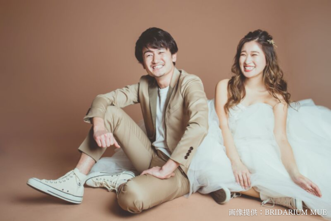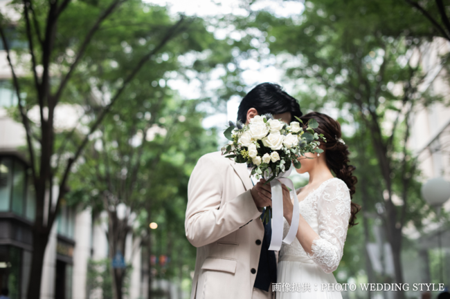 ふたりにフォーカスするシンプルな背景にも注目が集まっています。数年前は定番だったガーランドや赤い糸などのアイテムを持った撮影は減少傾向にあり、その一方で、衣装・ヘアメイク・ブーケなど、ふたりのコーディネートを重視する方は増加傾向にあります。そのため、自分たちが主役になれるようなシンプルさがニーズとマッチしているのではないかと考えられます。
