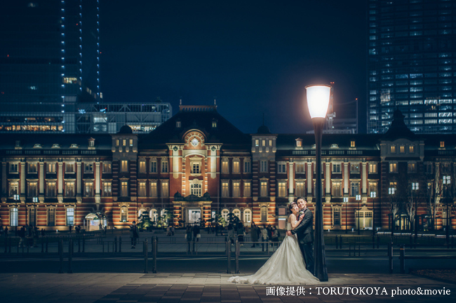 東京駅の駅舎をバックにした撮影は人気スポットとして定番となっていますが、他エリアにもナイトフォトスポットが多くあります。ふんわりとしたドレスやビジュー付きのドレスでの撮影が多く、「エモーショナル」、「ロマンチック」といった情緒的な写真を撮影したい方の、憧れの撮影場所として定着していると考えられます。