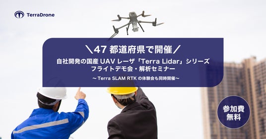 Terra Drone株式会社(本社:東京都渋谷区、代表:徳重 徹、以下 テラドローン)は、UAVレーザを活用した3次元測量を多くの人に体験いただくため、自社開発のUAVレーザ「Terra Lidar」 シリーズを使った無料デモ会を、全国47都道府県すべてで開催します。
