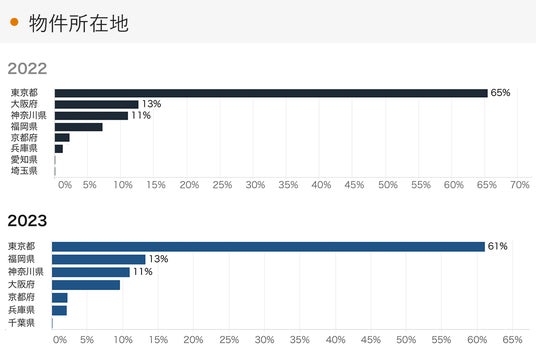 物件所在地は、東京都が最も多く61%(前年比4ptダウン)、そして福岡県が13%、神奈川県が11%となりました。去年2番目の割合を占めていた大阪府は4番目となり、そのほか京都府、兵庫県、千葉県と続きます。福岡県が伸びた要因は、2014年に国家戦略特別区域に指定されたことにより、近年続いて行われている再開発「天神ビッグバン」の影響であることが考えられます。