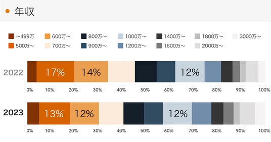 ボリュームゾーンは500万円台が13%(前年比4ptダウン)、600万円台と1,000万円~1,200万円未満台が同率で12%となっています。 2022年度と2023年度の年収帯を比較すると、ボリュームゾーンは500万円台と変わらないものの、 1,200万円以上の割合が増加しました。