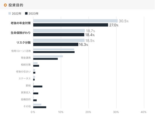 投資目的として最も多い回答は、「老後の年金対策」で27.0%(前年比3.5ptダウン)でした。続いて「生命保険がわり」 の18.4%、 「リスク分散」 の16.3%の順に回答がありました。顧客の声として「老後を考えた際、年金等の支給がかなり低く生活に苦労するなと思い、不労所得で少しでも生活に余裕がある生活が出来ればいいなと思い始めてみました」といった声がありました。