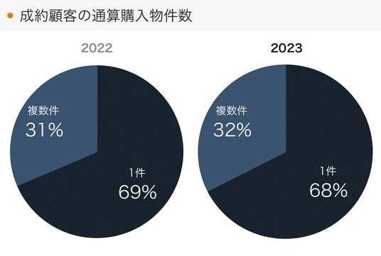 2023年度も前年度同様、一度購入した方が追加で物件購入する(通算購入回数)割合とともに、一度に複数物件購入する(通算購入物件数)割合も増加しました。