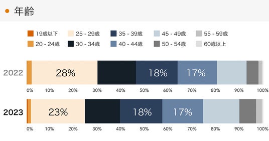 最も割合の多い年齢帯は25~29歳で23%、次に多い割合は35~39歳の18%、続いて40~44歳の17%と続きます。2023年度の各年齢帯ごとの割合は、20代後半の割合が少なくなり、40歳後半以上の割合が増えていることがわかります。2022年度と比較すると、各年齢帯の割合の差が少なくなり均等になっています。