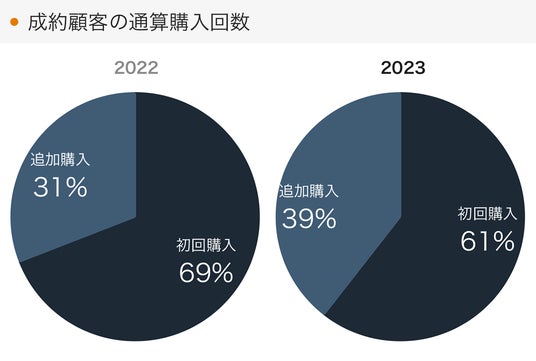 - 成約顧客の通算購入回数のうち、追加購入が39%(前年比8ptアップ)となり増加傾向に。