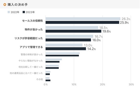 購入の決め手への回答は、「セールスの信頼性」の25.9%が最も多く、「物件が良かった」の19.6%、「リスクが許容範囲だった」の16.0%と続きます。「アプリで管理できる」と回答した方は14.2%(前年比1.2ptアップ)となっており、管理が手軽にできることに対して魅力を感じた方が増えていることがわかります。