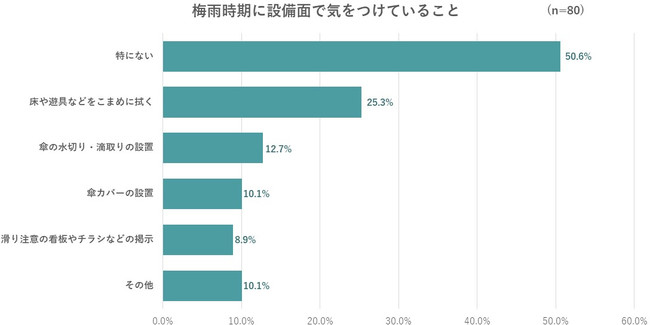 先程と同様「特にない」が多い結果にはなりましたが、約半数の施設は何かしら気をつけている事があるようです。「床や遊具などをこまめに拭く」が25%、「傘の水切り・滴取りの設置」「傘カバーの設置」「注意喚起の掲示」がそれぞれ10%前後でした。