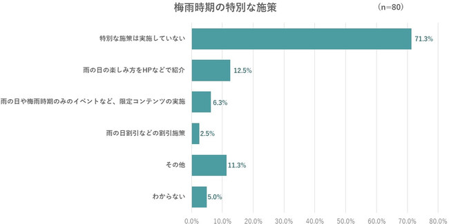 先程紹介した、広報・宣伝活動の結果と同様に、7割の施設が「特別な施策は実施していない」と回答。「雨の日の楽しみ方をHPなどで紹介」している施設が1割程度あるようです。