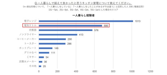 ・ 一人暮らしで揃えて良かったと思うキッチン家電として電気ケトルを選んだ人の理由は、「すぐにお湯を沸かせること」、次いで「安全にお湯を沸かせること」。そのうち半数がインスタント食品の調理のために使用していることが明らかに。