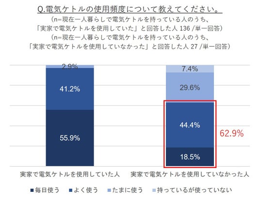 ・ 実家で暮らしていた時は電気ケトルを使用していなかった人のうち、62.9%が現在の電気ケトルの使用頻度について「毎日使う」「よく使う」と回答。