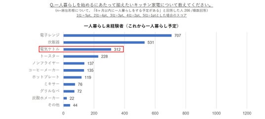- 現在一人暮らしをしている人および一人暮らし経験のある人に、一人暮らしで揃えて良かったと思うキッチン家電に1~5位の順位をつけていただきスコア化したところ、1位は電子レンジ、2位は電気ケトル、3位は炊飯器という結果に。一方、半年以内に一人暮らしを始めると答えた人が選ぶ「一人暮らしで揃えたいキッチン家電」は、1位が電子レンジ、2位は炊飯器、3位は電気ケトルという結果になりました。