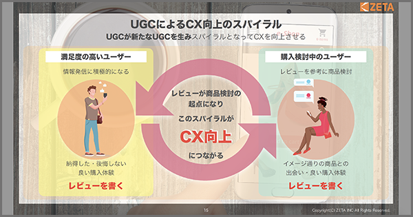 今後ますますECサイト上での情報シェアやコミュニケーションは活発化し、ユーザーを起点とした動きが広がっていくとみられ、ユーザーから生まれたコンテンツが新たな購買につながりスパイラルとなって、UGCによるコマース経済圏が生まれつつあるのではないかとお話いたしました。
