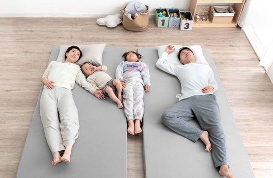 (画像:連結されていない2枚のマットに家族で寝たイメージ)