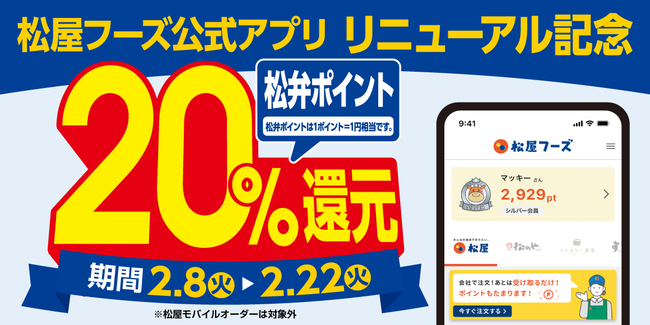 テイクアウト需要の拡大を受け、「松弁ネット」の拡充を行ってまいりましたが、今月1日、よりお得で使いやすくするために「松屋フーズ公式アプリ」のリニューアルを実施しました。そしてこの度、アプリリニューアルを記念して「松弁ネット」の松弁ポイント「20%還元キャンペーン」を開催いたします。