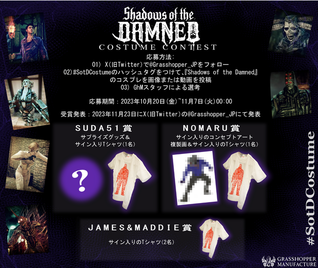 投稿していただいたコスプレは“グラスホッパー・マニファクチュア”のCEO、“SUDA51”こと須田、SotDのコンセプトアーティスト能丸督之、そしてコミュニティマネージャーのJamesとMaddieによって選定され、11月23日にX(旧Twitter)で発表!