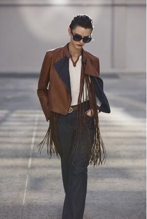 デニムならではの構築的なシルエットが特徴のジャケットは、マニッシュなパンツと、レザ―パイピングが施されたべストは、同コレクションのフロントのカッティングが美しいロングスカートとのコーディネートがおすすめです。また、クリーンな印象のパンツスーツは、インナーのトップスでマスキュリンとフェミニンのバランスが絶妙なスタイルに仕上がります。シューズは、手編みの刺繍やデニムのディテールなど、テキサスからインスパイアされたウエスタンスタイルのシューズです。